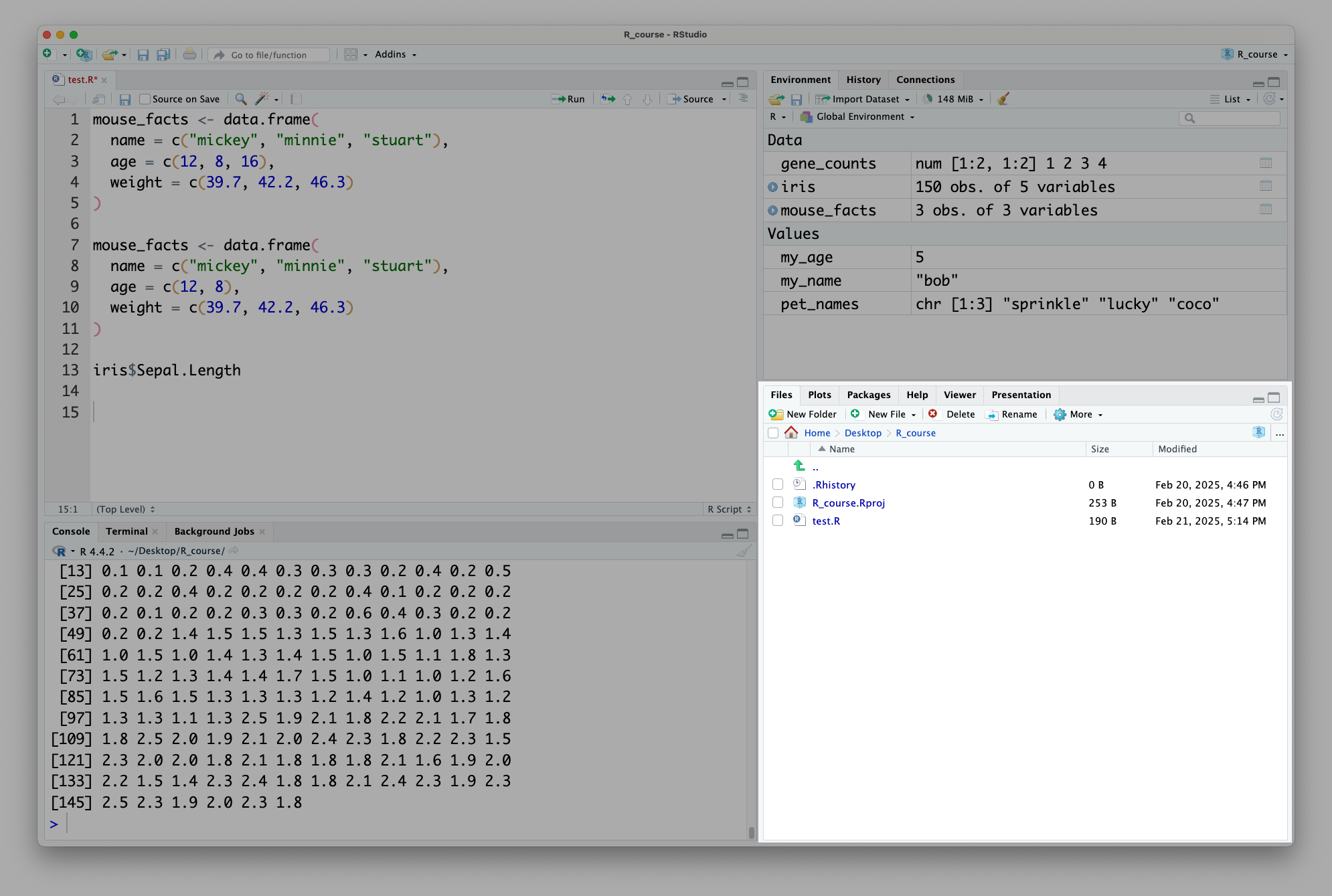 You’ll notice I named my project using an underscore (r_course) rather than a space (r course). In general, when coding we want to name things without spaces, so that it is clear to the computer that we are talking about a single entity (the ‘r_course’) as opposed to multiple things (‘r’ and ‘course’). We’ll revisit this idea later in the session in Section 1.4