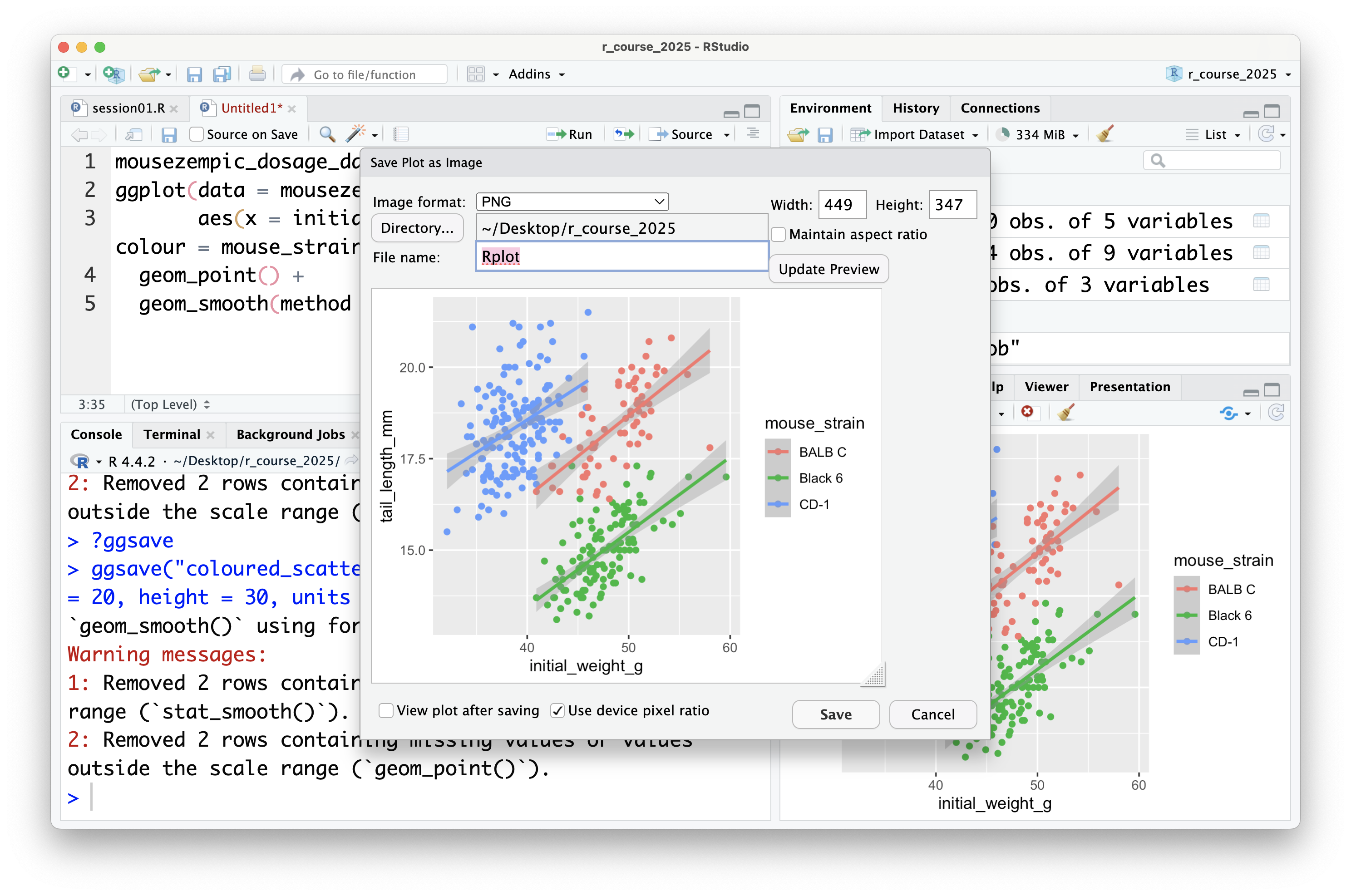 - How to save a plot to a file using the `ggsave()` function, or through the RStudio plot window