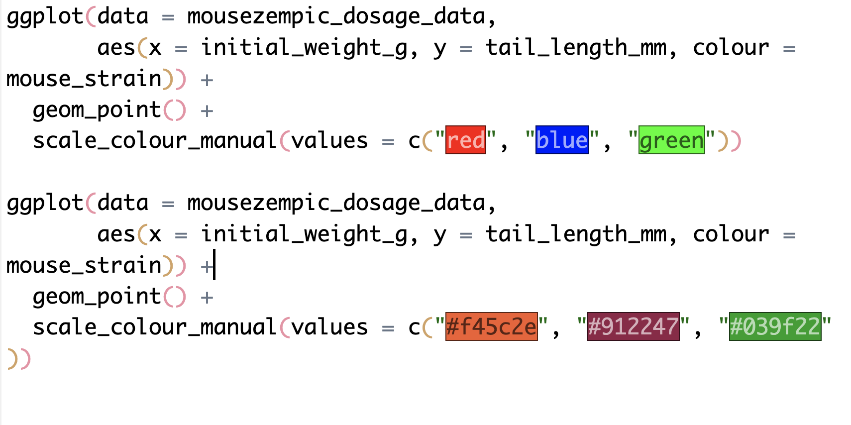 We can also add additional aesthetics to the plot beyond just `x` and `y`. For example, let's use the `colour` aesthetic to represent the strain of each mouse. To do this, we add `colour = strain` to the `aes()` function that describes the mapping in the `ggplot()` call: