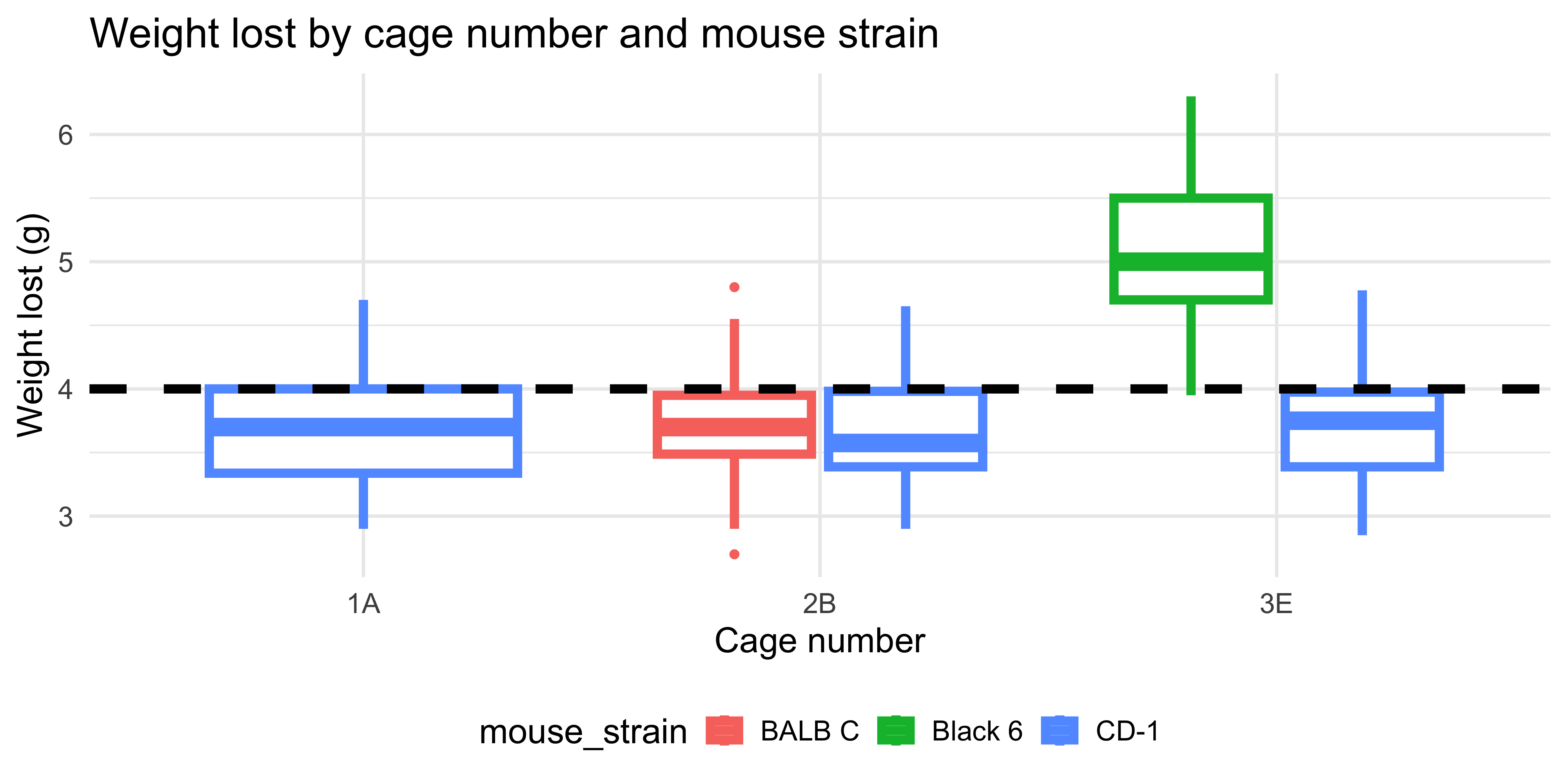 a. Boxplots of the weight lost (in grams), with one for each sex in each cage. The boxplots are coloured by sex and the width of the boxplots is set to 0.5 so they are a bit skinnier than usual. A dashed line is drawn at y = 4 (4g of weight lost), and the legend is placed at the bottom of the plot. The plot uses a minimal theme.